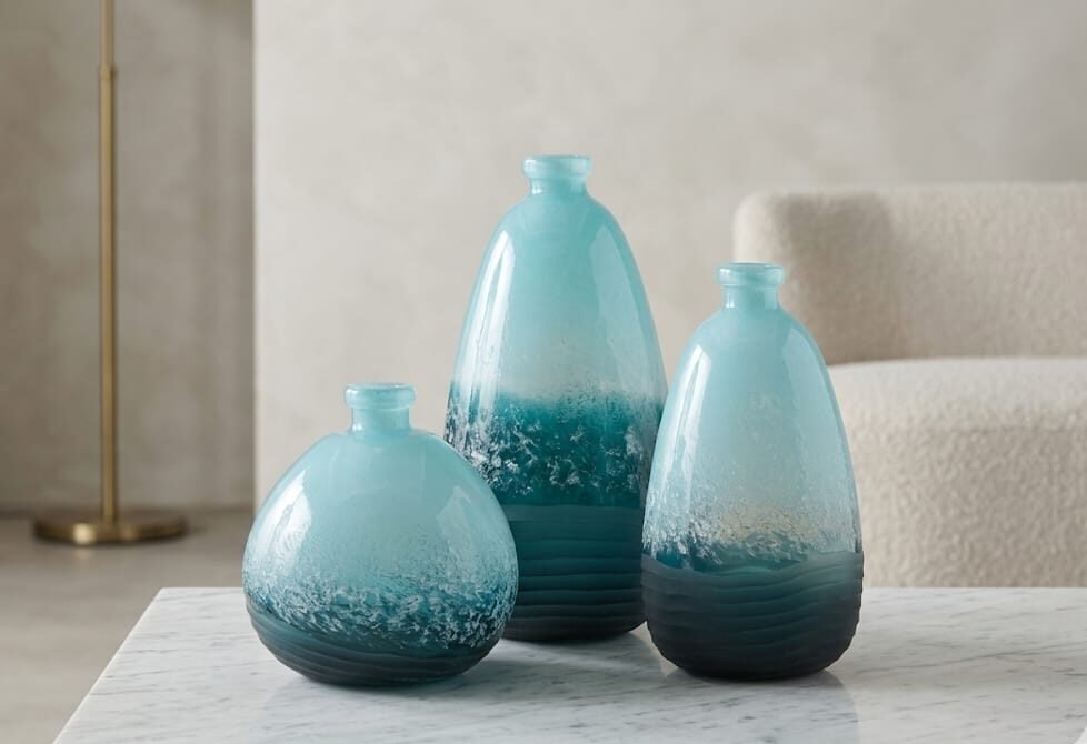 Capture the serene beauty of the ocean with this hand-finished art glass trio. Featuring a striking gradient from deep indigo to airy azure, each vase is defined by its unique “sea-spray” texture and sculptural, rippled base.